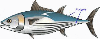 Fish of the tuna and mackerel families have a number of small finlets between their final dorsal fin and the caudal fin, with a further set below.