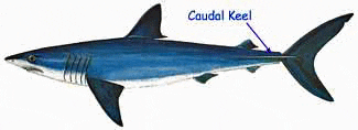 Fast-swimming fish species like the mako shark shown here often have one or two pairs of caudal keels which add stability to the caudal fin.